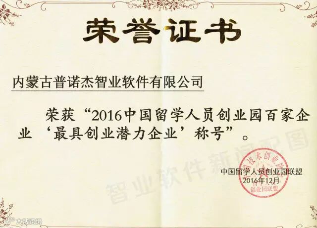 “中国留学人员创业园百家企业”为中国技术创业协会留学人员创业园联盟在科技部、教育部、人社部、国家外国专家局以及致公党中央的共同指导下,为了更好地展现留学人员创业园和留学人员企业优秀成果,弘扬创业创新精神,形成示范带动效应,自2010年起发起举办的评选活动。在2016年第六届评选中,有16家企业入围“中国留学人员创业园百家最具成长性创业企业”;有37 家企业入围“中国留学人员创业园百家最具创业潜力企业”,内蒙古普诺杰智业软件有限公司凭借近年来在技术、产品方面的创新以及公司快速成长所带来的良好的社会效益和经济效益,成为内蒙唯一一家荣获“2016中国留学人员创业园百家企业‘最具创业潜力企业’称号” 的企业。