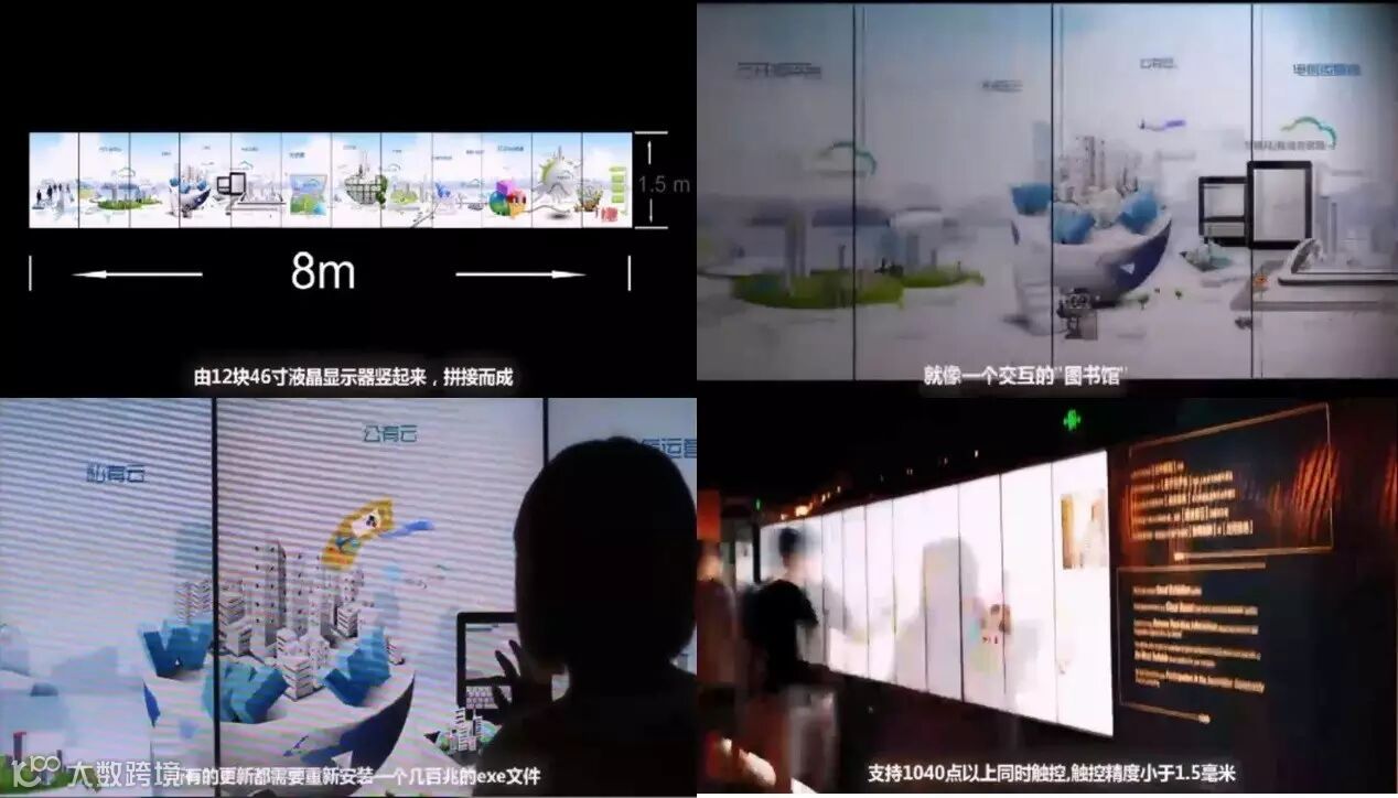 视频中的例子是可以多人多点触摸的,12块屏幕拼接,8m长。我们也是第一个在H5应用里面实现多人多点的技术,这是全球直接可以使用的一个案子。