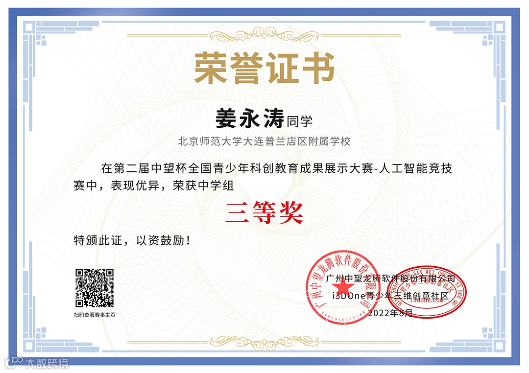 以下是北京师范大学大连普兰店区附属学校姜永涛同学分享的比赛心得。姜永涛同学喜欢挑战新事物,对人工智能非常感兴趣。在探索学习的道路上,勤奋刻苦,喜欢自主思考如果解决问题,在遇到困难时,也会虚心请教老师帮忙。最终经过努力,在本次“中望杯”人工智能竞技赛中,姜永涛同学取得中学组三等奖的好成绩,接下来让我们来看看他的获奖感想吧!