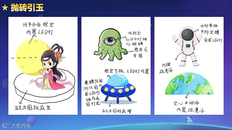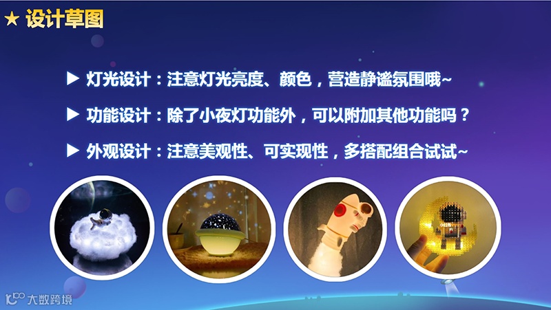 发散思维整合后就生成了创意集,我再进一步思考,从每一个创意的建模难度、打印成本、实践可行性、生活中的实用性、对学生的教学意义等多个方面思考,综合考量决定采用载体的形式。在“逐梦航天,探索未来”这一主题下,考虑到学生实际的动手能力、制作成本、生活实用性,我最终决定采用灯这个智能硬件常用的入门载体。