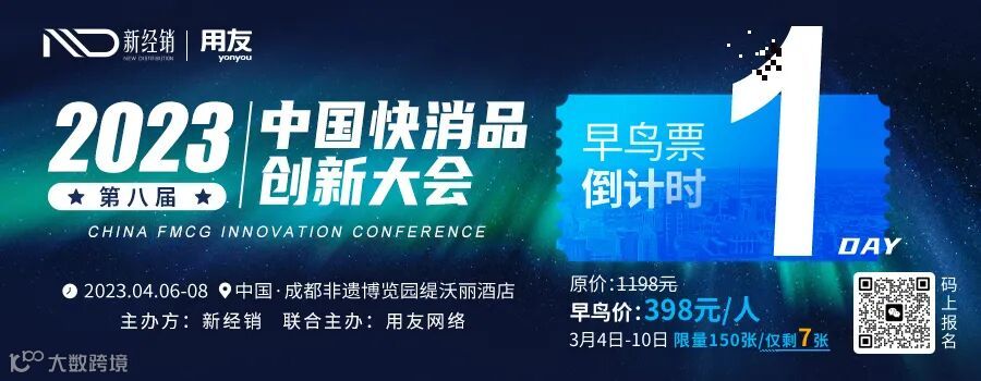 PS:2023年4月6日-8日,2023中国快消品创新大会将在成都非遗博览园缇沃丽酒店(青羊区光华大道2段601)盛大举行。