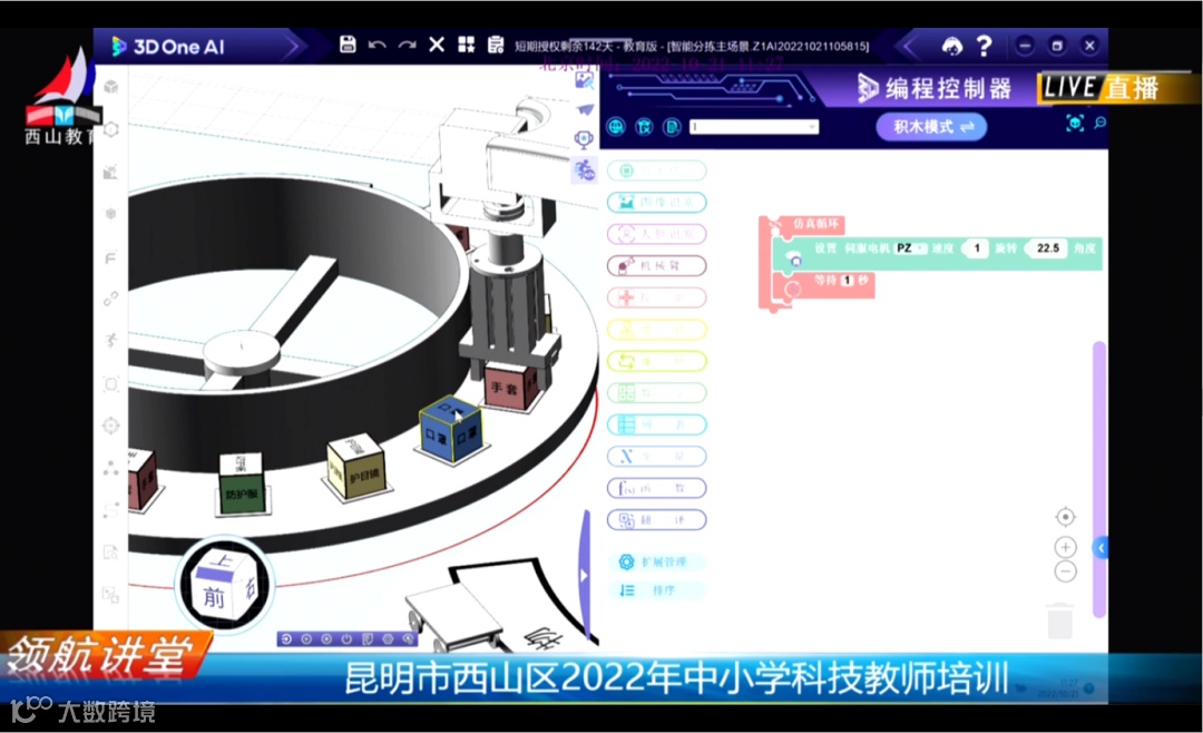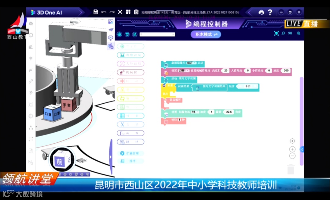为了让与会的老师更直观地体会利用3D One AI(中望人工智能三维仿真软件)实现作品创意的全过程,更好地掌握物资分拣主题赛规则。在软件实操环节,何老师先是围绕软件界面和基本操作进行介绍。在与会老师对软件有了基本认识后,再将如何控制转盘和机械臂、如何利用图像识别技术来判断物资的类型、利用机械臂夹取物资和如何将物资放置堆放区内的程序编写步骤逐步拆分,引导大家发散思维、参与创作。老师们热情高涨,积极参与!