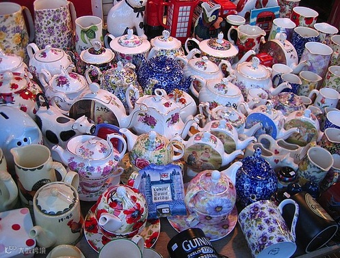 英国:伦敦机场的古玩、陶器、绒布料。