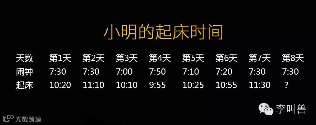 这是再也简单不过的预测了,大部分人会预测小明第8天仍然会赖床,可能会在10-11点起床。