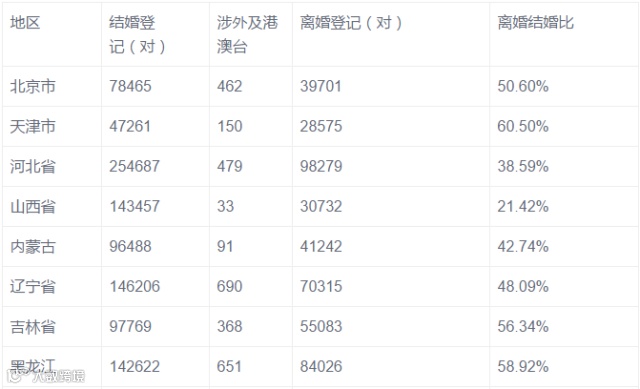 最新数据显示,2017上半年全国各级民政部门和婚姻登记机构共依法办理结婚登记558万对,比去年下降7.5%;依法办理离婚登记185.6万对,比去年同期上升10.3%。其中离婚结婚比最高前三甲分别为天津市、黑龙江、吉林省,离婚结婚比分别为60.50%、58.92%、56.34%,北京市以50.60%屈居第四。离婚结婚比最低的省份分别为西藏、甘肃和青海,离婚结婚比分别为10.53%、16.92%、17.06%。