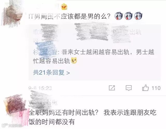 调查显示,在中国,出轨的女性中,18.6%是全职妈妈为了寻求激情,其次是教师13.8%,医生8.6%,文秘7.2%,设计师6.1%。