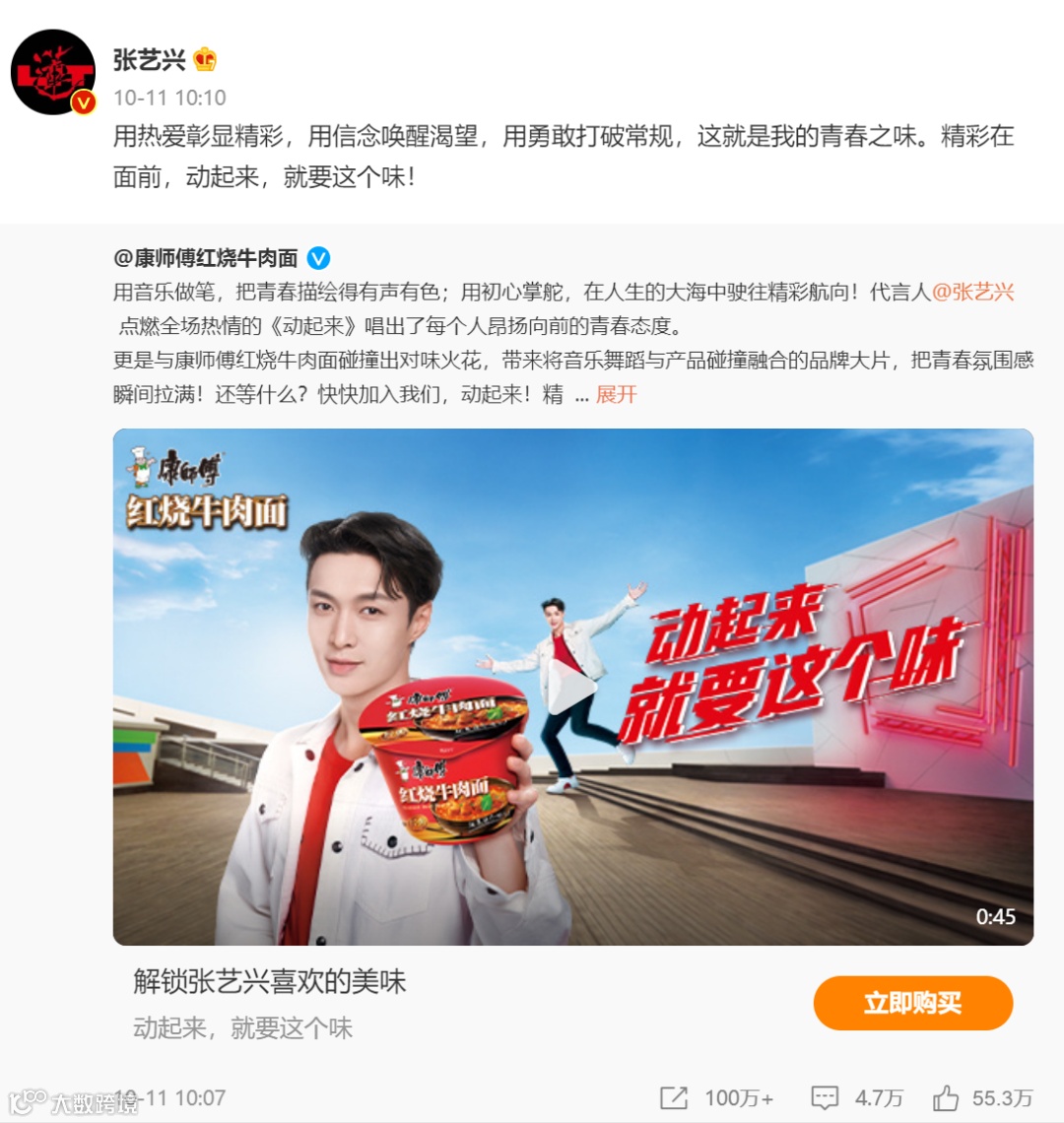 从张艺兴生日后于个人主阵地微博帐号发布首支全新单曲《动起来》,到康师傅红烧牛肉面以《动起来》为品牌单曲,并发布全新Brand Video《动起来 就要这个味》,再到各平台发布广告片拍摄视频花絮,与粉丝积极互动,康师傅红烧牛肉面携手张艺兴以长线宣传与受众双向沟通,进行了一场声势浩大的热情互动,沉浸式调动粉丝势能,引爆品牌声量。