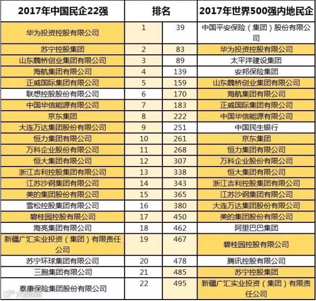 根据2017中国民企500强名单,同样入围2017世界500强的企业有16家,比去年增加了4家。2017世界500强有115家中国企业上榜,其中内地民企有20家,整体来看500强民企上榜世界500强企业数量较少,实力有待增强。