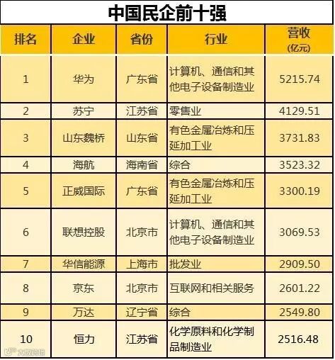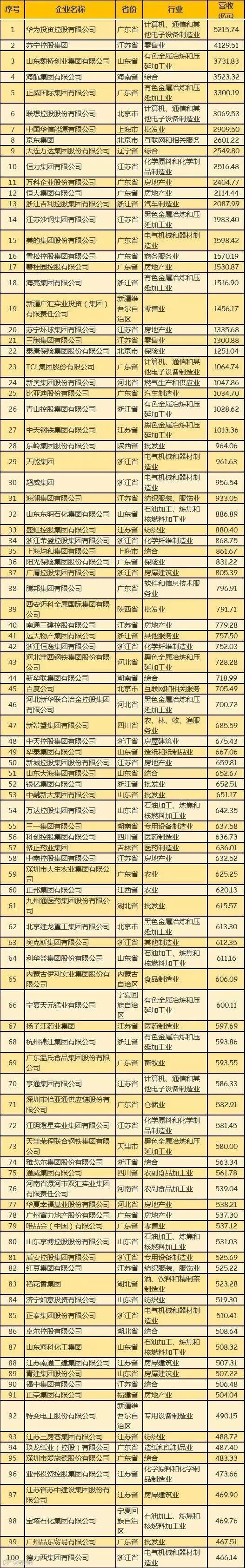 有6家企业营收突破3000亿元,分别是:华为、苏宁控股、山东魏桥、海航、正威国际、联想控股。(总榜单见文末)