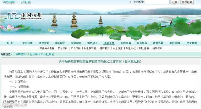 8月25日,《关于加快培育和发展住房租赁市场试点工作方案》(征求意见稿)在“中国杭州”政府门户网站进行网上听证。(可以点击本文左下角“阅读原文”进行查看)