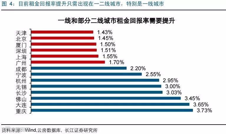 而目前租金回报率提升只需出现在一二线城市,特别是一线城市。因为租金回报率在大部分二线和三线城市已经达到3%~4%的水平,所以不需要提升,需要提升的就是一线和某些二线城市的租金回报率。