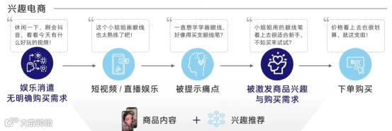 传统电商的模式是,用户现有需求,主动搜索货物,然后下单购买。兴趣电商的模式是,用户本无购买需求,通过短视频和直播,被提出了需求痛点,激发了对商品的兴趣,从而购买。