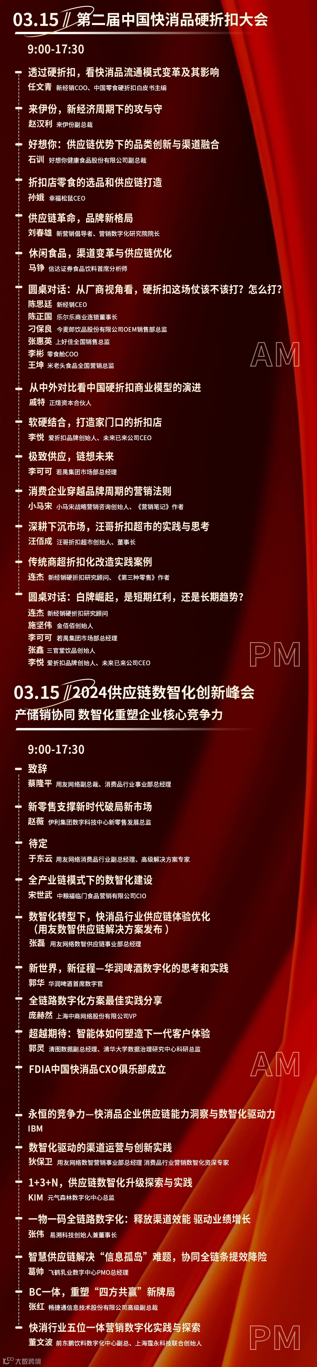 本届大会由新经销主办、安得智联、用友数智化联合主办;第二届中国快消品经销商大会由舟谱数据联合主办;2024供应链数智化创新峰会由用友集团联合主办。