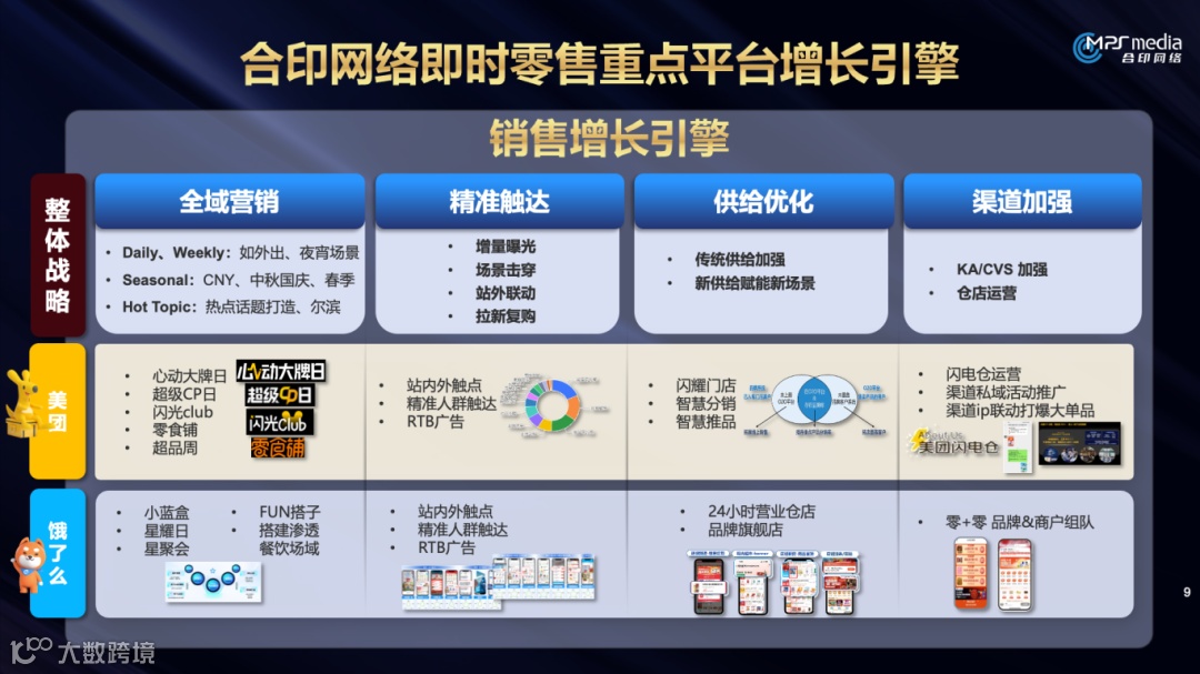 合印网络在即时零售的销售增长引擎有四个方面:全域营销、精准触达、供给优化、渠道加强。