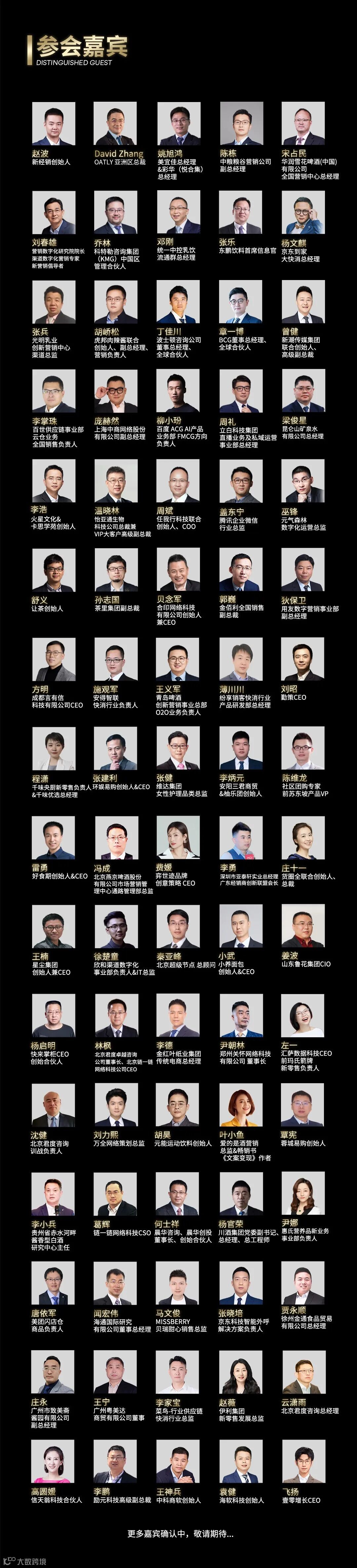 截止目前已确认的部分重磅嘉宾有:波士顿咨询公司董事总经理、全球合伙人丁佳川;美宜佳控股总经理、彩华商贸(悦合集)总经理姚旭鸿;华润雪花啤酒(中国)有限公司全国营销中心总经理宋占民;OATLY 亚洲区总裁 David Zhang;统一中控乳饮流通群总经理邓刚;京东到家大快消总经理杨文麒;科特勒咨询集团(KMG)中国区管理合伙人乔林;东鹏饮料首席信息官张乐......