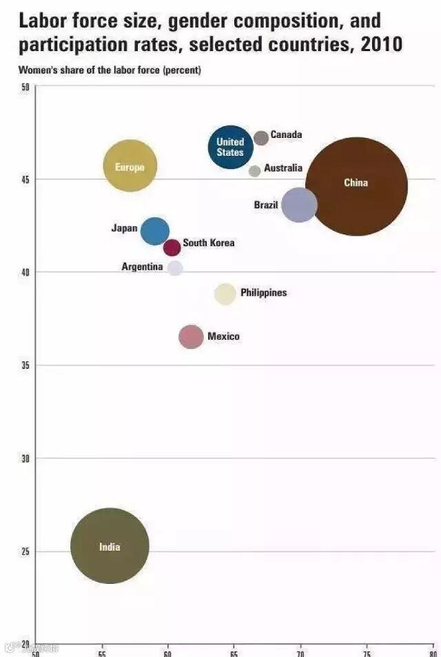 世界各国劳动参与率,圆的面积代表劳动总量,中国排名第一;横轴代表劳动参与率,中国达到76%,一样是世界第一。