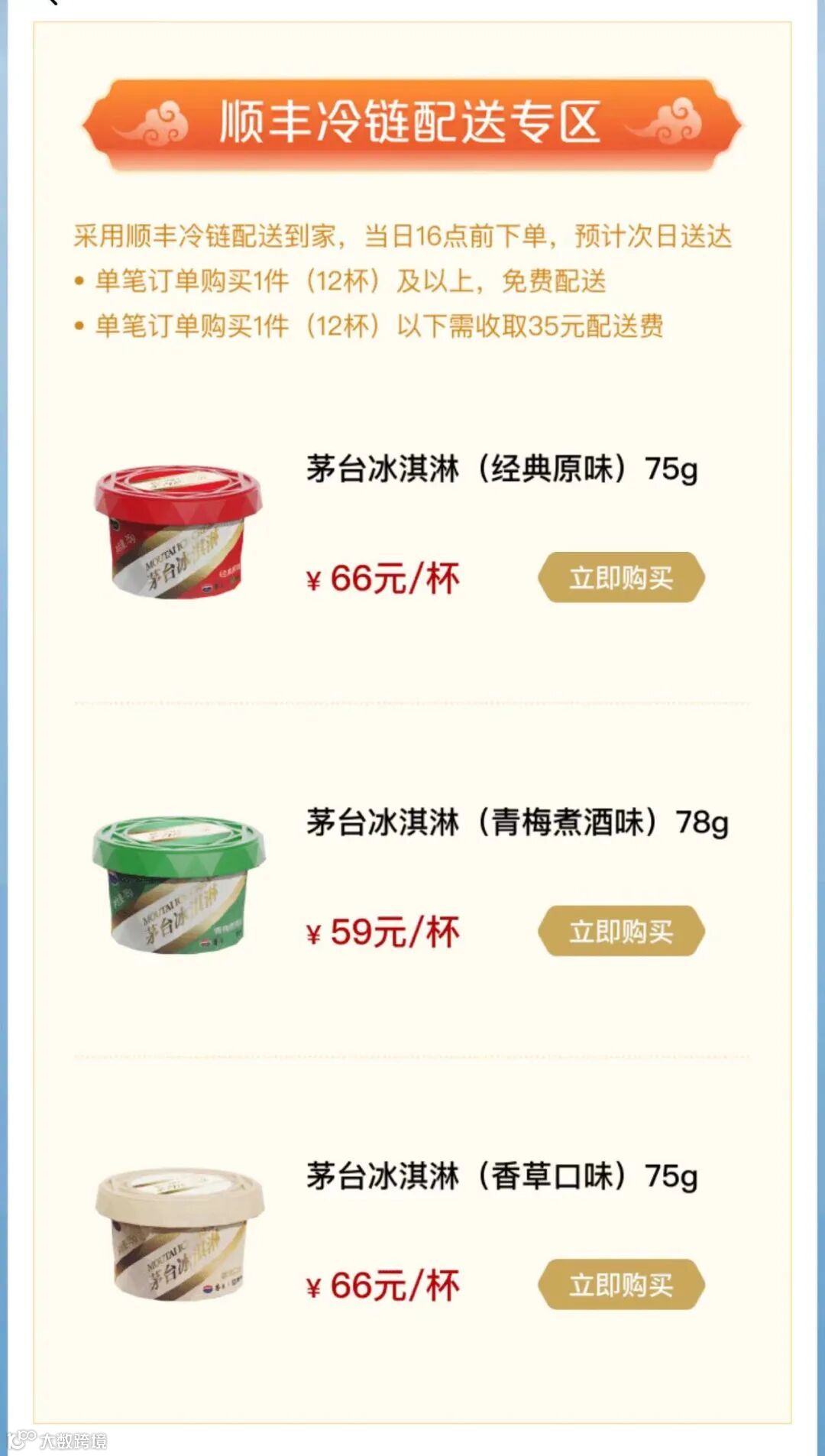 茅台官方声称,5月29日之后,消费者可以在“i茅台”上下单,到时开通了冷链配送,其他城市的消费者也有机会品尝到茅台冰淇淋。未来,茅台的经销商可以开加盟店。