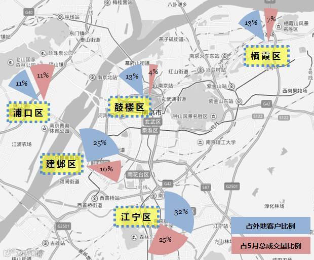 图:外地客户在南京看房区域分布TOP5及该区域5月成交量占比