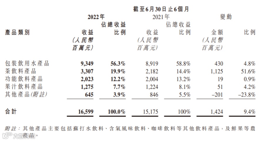 其中,包装饮用水产品的收益较去年上半年同期增长4.8%,占总收益占比为56.3%。饮料产品的收益较去年同期增长18.8%,占总收益占比为43.0%。