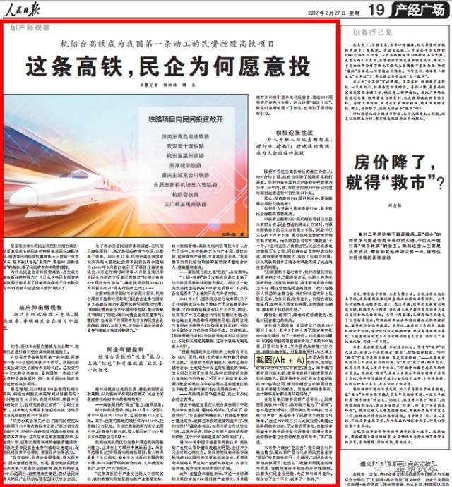 2月27日,《人民日报》推出杭绍台高铁特稿——《这条高铁,民企为何愿意投》,在第19版“产经广场”上长篇刊载。