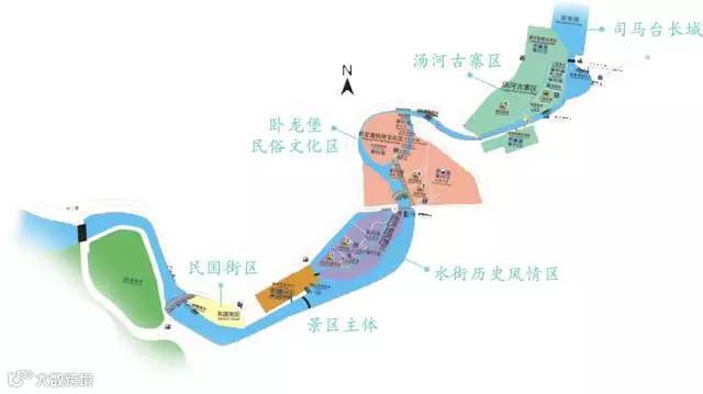 景区沿主一路呈东北-西南向条带状分布;古镇与保护区严格分离,古北水镇包含景区主体和司马台长城两大板块;其中,景区主体主要包括以下四大板块:民国街区、水街历史风情区、卧龙堡民俗文化区、汤河古寨区。