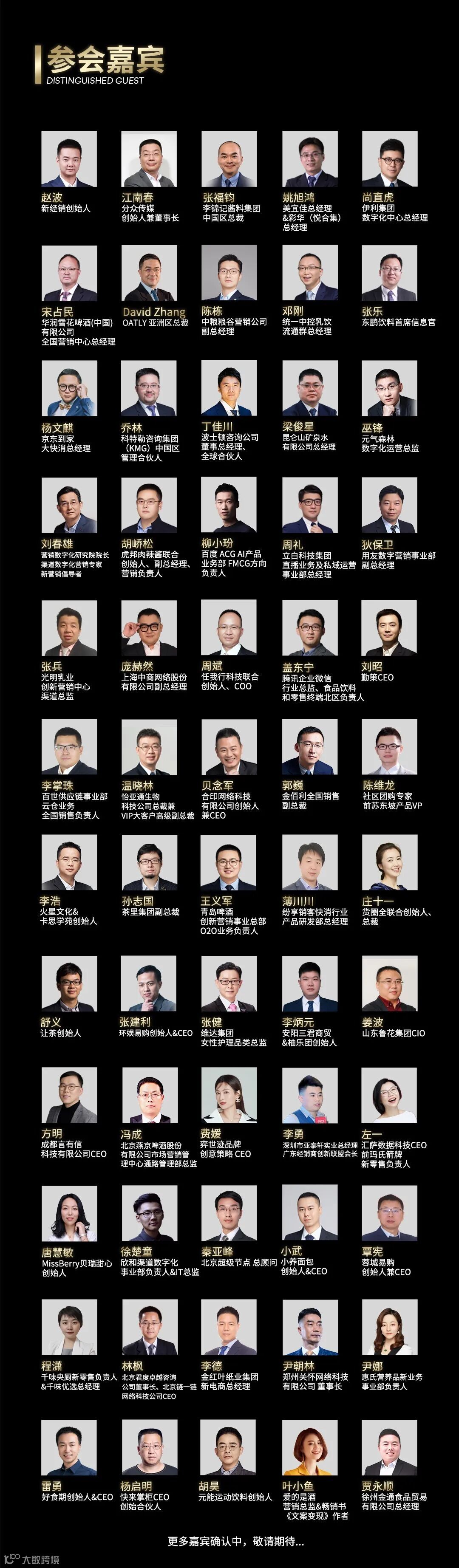 截止目前已确认的部分重磅嘉宾有:波士顿咨询公司董事总经理&全球合伙人丁佳川、美宜佳总经理&彩华(悦合集)总经理姚旭鸿、华润雪花啤酒(中国)有限公司全国营销中心总经理宋占民、OATLY 亚洲区总裁 David Zhang、统一中控乳饮流通群总经理邓刚、京东到家大快消总经理杨文麒、科特勒咨询集团(KMG)中国区管理合伙人乔林、东鹏饮料首席信息官张乐......