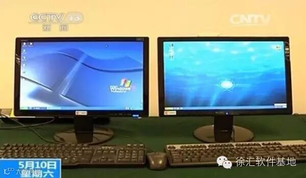 画面中的这两台电脑分别使用的是国外和国产操作系统。画面左侧是Windows XP操作系统,右侧是中标麒麟桌面操作系统。