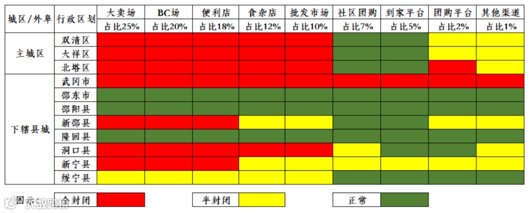 首先迅速整理所在城市主城区和各县城的行政区划封控情况,然后按照生意贡献排序将渠道维度对应进去,匹配出每个区域主要渠道的最新防疫封闭级别,要查清关键的区域和渠道是处于全封闭、半封闭还是正常状态。