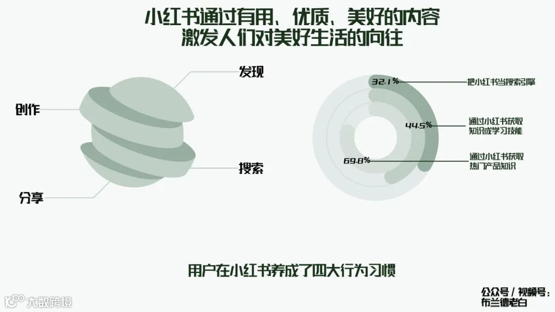32.1%的用户把小红书当搜索引擎用,44.5%的用户通过小红书获取知识或学习技能,69.8%的用户通过小红书获取热门产品知识。