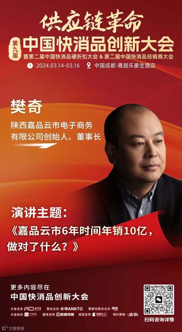 陕西嘉品云市电子商务有限公司创始人、董事长樊奇确认出席第二届中国快消品经销商大会并发表主题演讲——《嘉品云市6年时间年销十亿,做对了什么》。