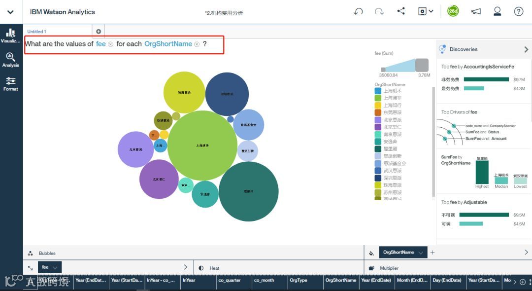 比如我想要看到各个机构的项目费用,那么输入sum fee(总费用)和org short name(机构简称)的英文单词,点击回车就会出来几个问题,选中想要分析的问题即可进入到分析面板。