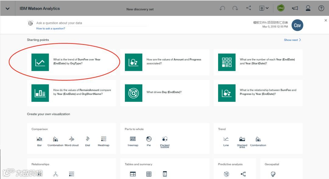 在 Discovery 分析和探索页面,Watson “猜”出了你可能想要分析的问题。