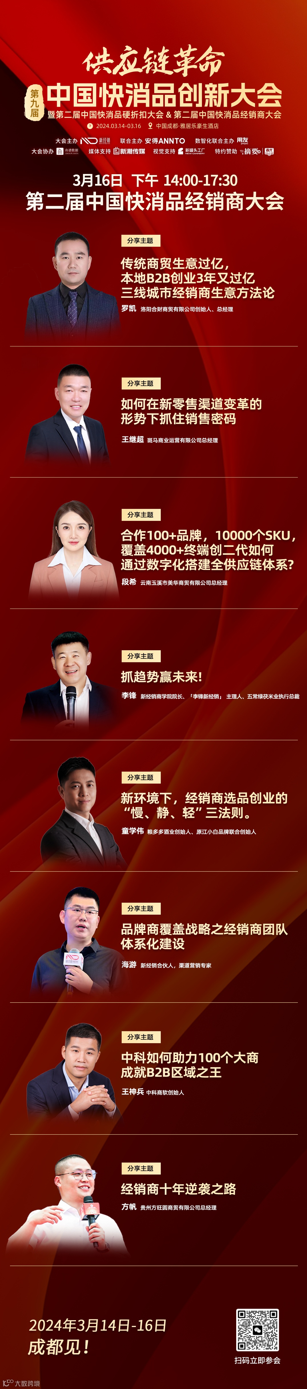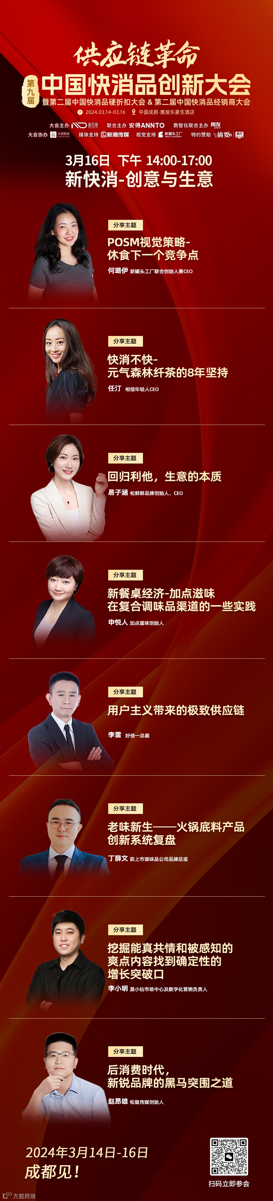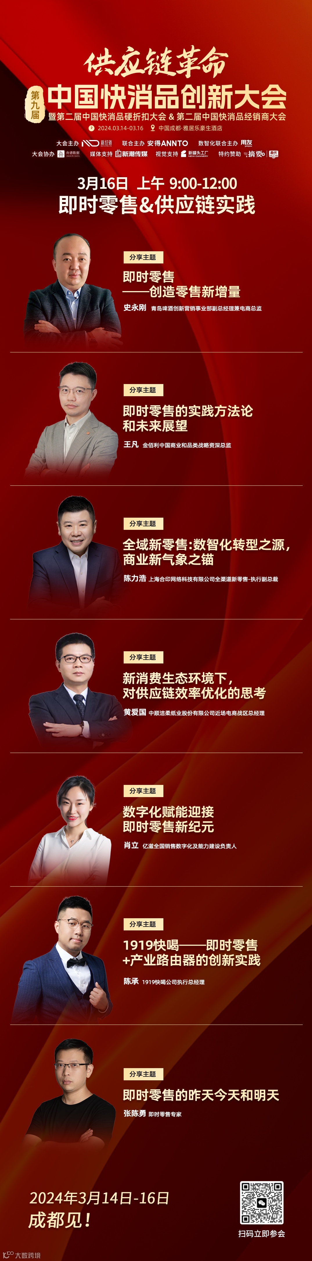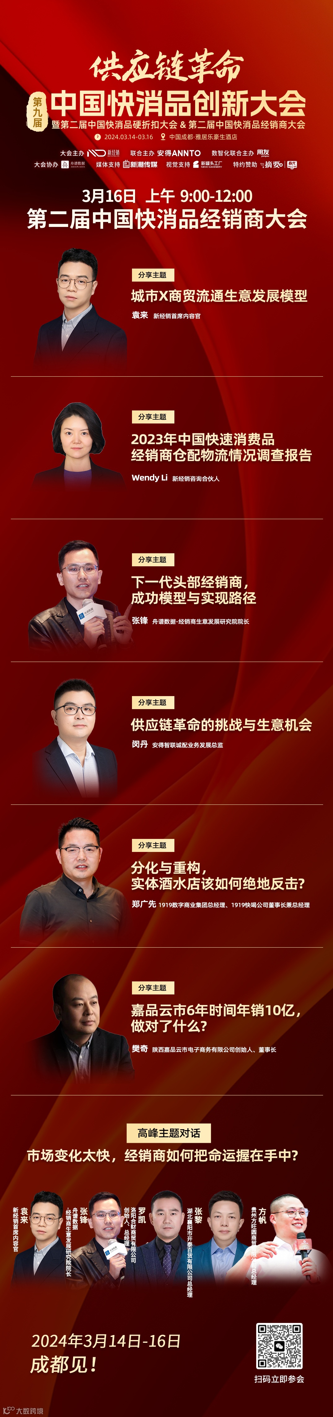 围绕“供应链革命”主题,将与来自全国的数千名快消品品牌商、经销商以及零售变革者、产业服务者一起相约成都,持续烧脑,共同探讨供应链革命时代的挑战与机遇,变革与出路。