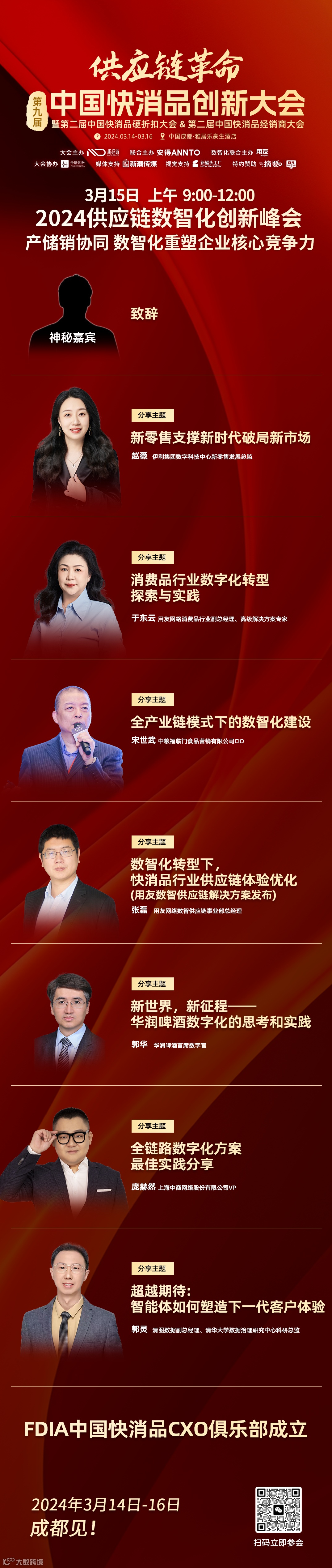 3月14日-16日,中国成都,3天时间,80+大咖嘉宾干货分享,3场主论坛,1场数智化创新峰会,2场分论坛,2场闭门会,3场闭门研讨会,2场预热场分享会,1天半【极致供应链】品牌工厂现采会。