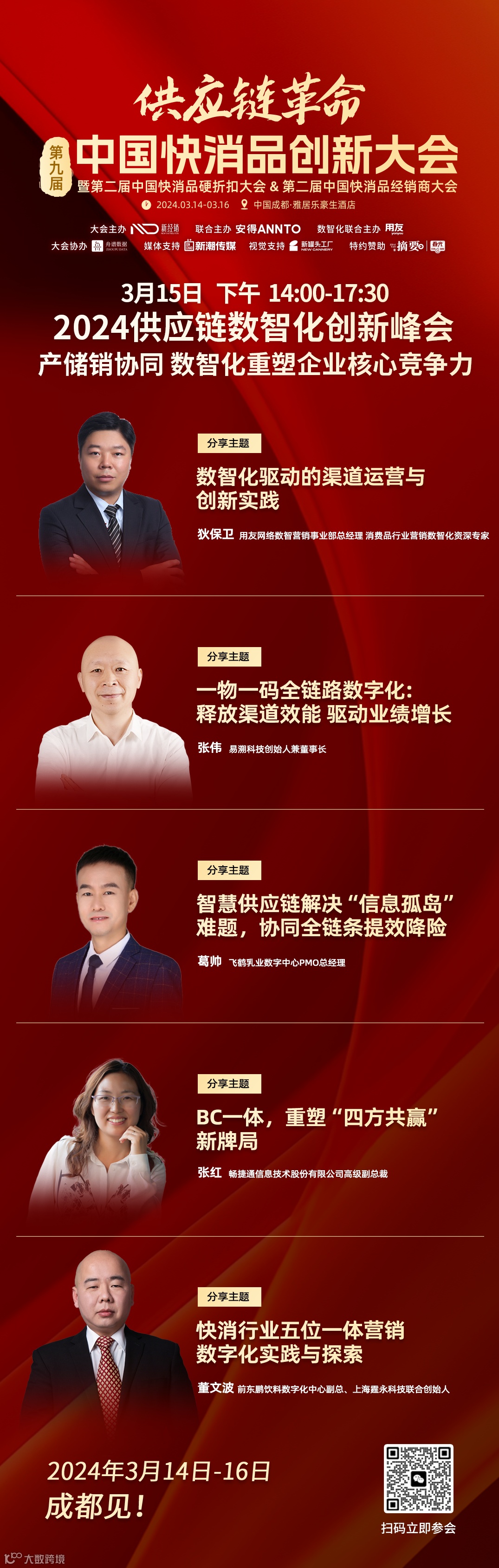 本届大会由新经销主办、安得智联、用友数智化联合主办;第二届中国快消品经销商大会由舟谱数据联合主办;2024供应链数智化创新峰会由用友集团联合主办。
