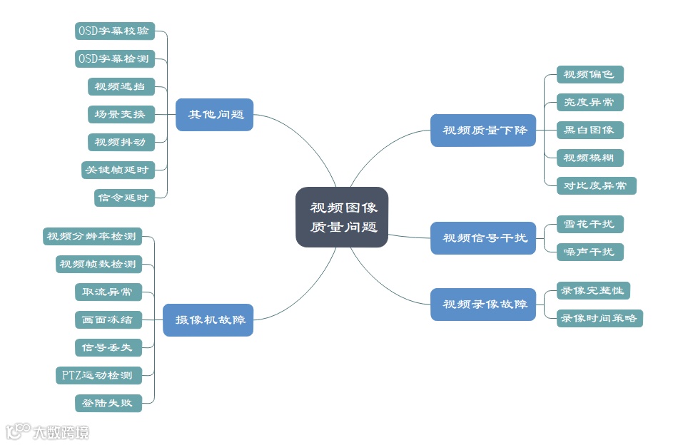 目前智能视频质量诊断系统可判断的视频图像质量问题已基本覆盖日常视频监控系统常见的异常状况,并在此基础上适当进行了延展,如图所示: