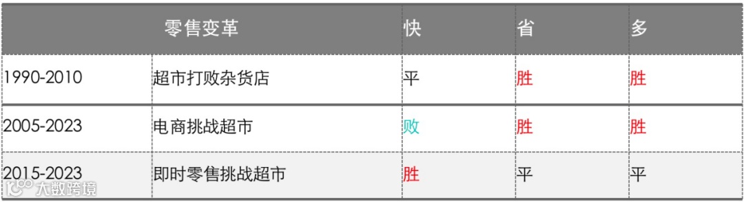 第一个变革,是超市打败杂货店。超市和杂货店相比,在“快”的维度,是持平的,但在“省”和“多”上,超市具备更强的竞争优势,所以最终超市把杂货店打得溃不成军。