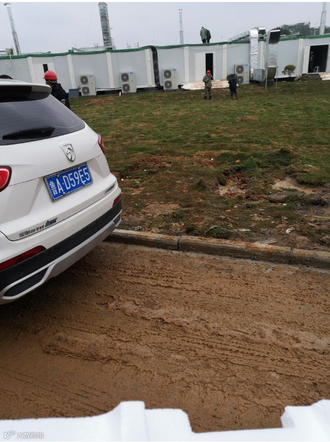 17:35分我们到达了火神山。火神山建设区和隔离区是分开的,我们看能远远地看到隔离区那边医护人员穿着防护服,来回奔走。