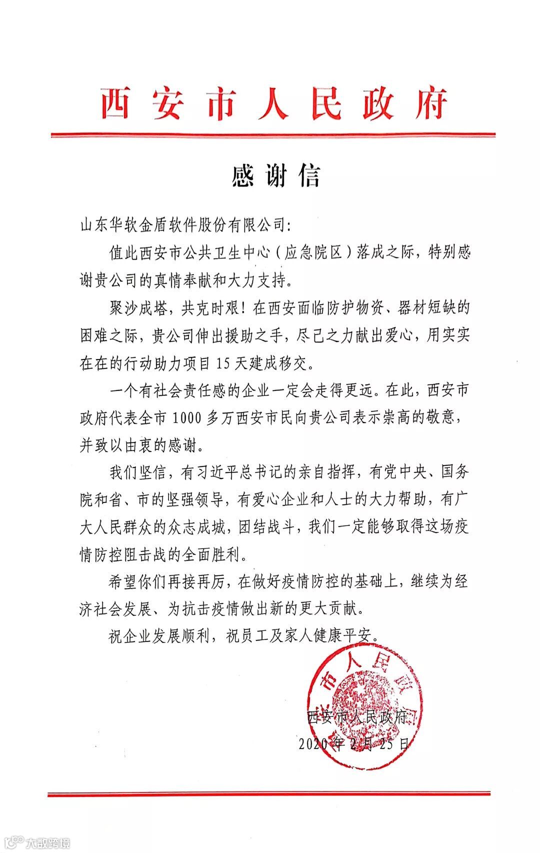 西安市政府高度赞扬了我司的此次支援行动,并表达了诚挚的谢意。“隔离病毒,不隔离爱”,金盾软件将勇担企业的社会责任,继续为打赢疫情阻击战贡献力量。