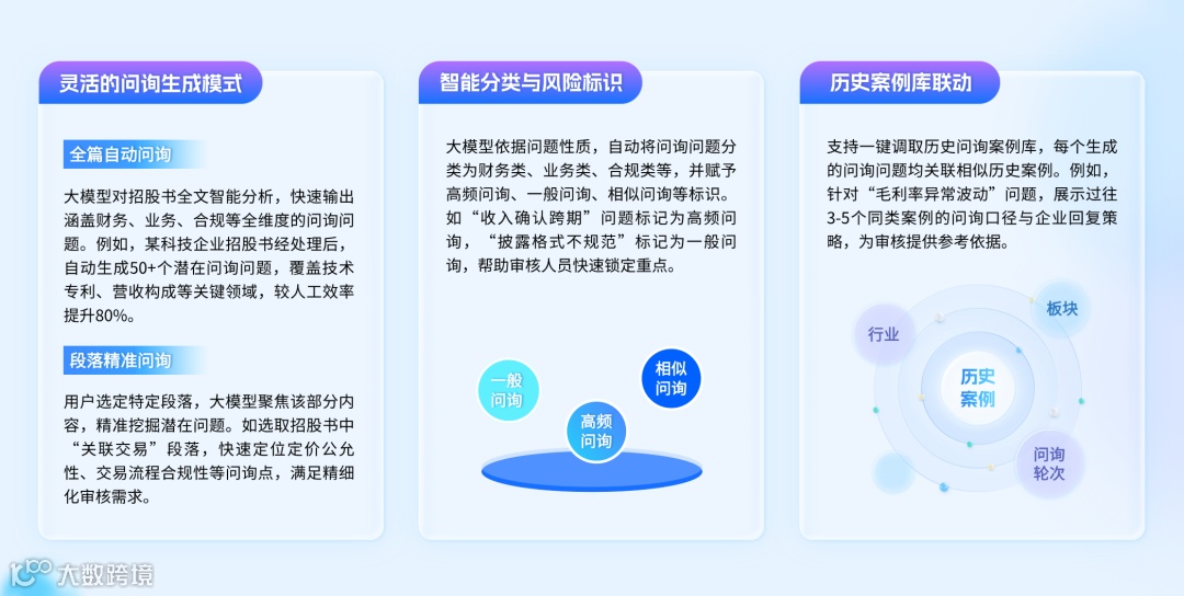 快速预审反馈:Agent能在短时间内完成招股书预审,基于过往问询反馈案例学习训练,快速发现问题,减少问询轮次,缩短审核周期。