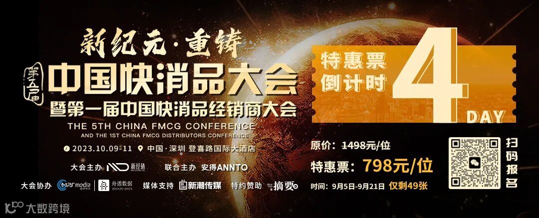 PS:2023年10月9日-11日,由新经销主办、安得智联联合主办的第五届中国快消品大会暨第一届中国快消品经销商大会将在深圳盛大举行;第一届中国快消品经销商大会将由舟谱数据联合主办;即时零售论坛专场将由合印网络联合主办。