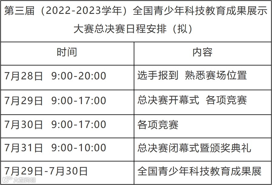 各竞赛项目具体比赛日程安排详见总决赛参赛手册,手册将于2023年7月28日参赛队员报到时领取。