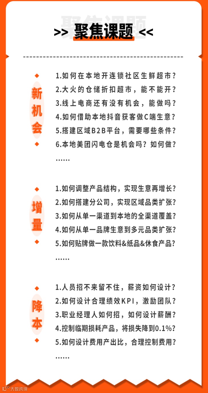 关于外界新的生意机会,比如抖音电商、社区团店、美团闪电仓等;关于内部生意增长和降低成本的方法,如薪酬管理、合伙人制度、账款管理、新品推广等。