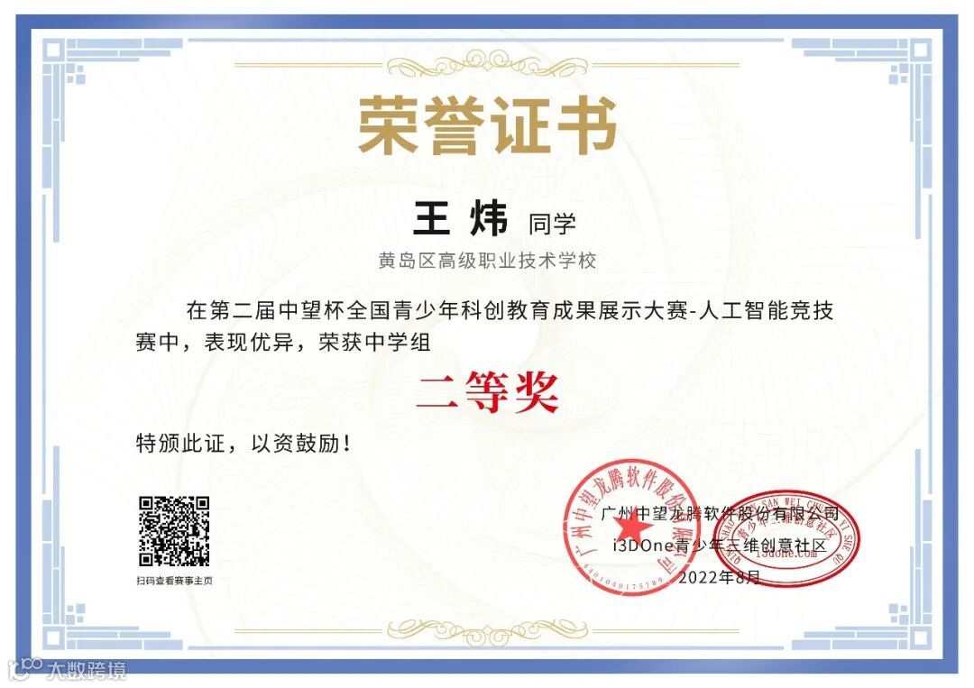 以下是青岛西海岸新区高级职业技术学校王炜同学分享的参赛心得。王炜同学在人工智能的学习道路上一直保持自己学习的初心和对科技创新的热爱,每一次比赛都全力以赴,在本次“中望杯”人工智能竞技赛取得中学组二等奖的好成绩,接下来让我们一起来看看他的参赛故事吧!