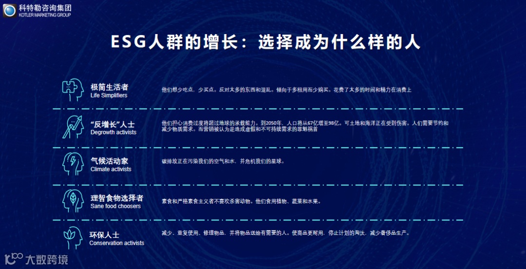 比如说这些人他们是极简生活者,他们会简化自己的生活,遵循一个3R原则,叫做我不买过多的用品,我把有限的钱,投到最好的产品当中去,最适合我的产品当中去,我的生活遵循3R的原则,减少不必要的购买。这里面有极简生活者,反增长人士,理智的食物选择者,我选择我成为一个理智的食物选择者,少吃动物肌蛋白,特别是少吃牛肉,为什么?