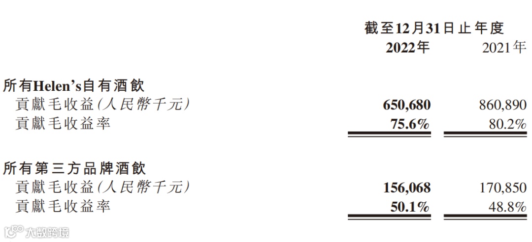 而现在,一方面海伦司因原材料上涨压力,此前已经宣布了一轮涨价,涨幅在2毛到9毛之间。但是财报显示,海伦司自有酒饮的贡献毛利率开始降低,从2021年的80.2%降到2022年的75.6%。