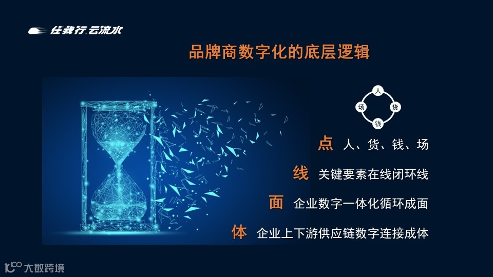 品牌商供应链数字化的底层逻辑就是“点线面体,人货场钱”串起来形成闭环,形成经销商面,再把经销商品牌商、服务商整个连起来,形成立体管道,这就是供应链数字化。