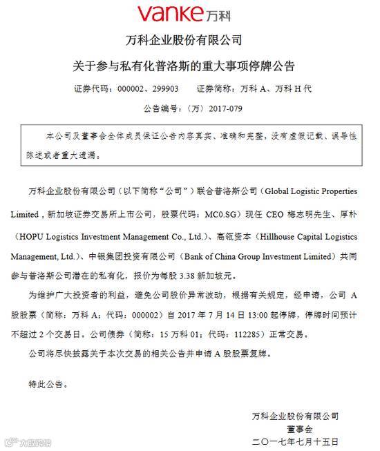 万科7月14日发布公告称,公司与其余公司对普洛斯公司股份每股3.38新加坡元的报价,共同参与普洛斯公司潜在的私有化。万科今日下午开市起停牌,因重大事件未公布。