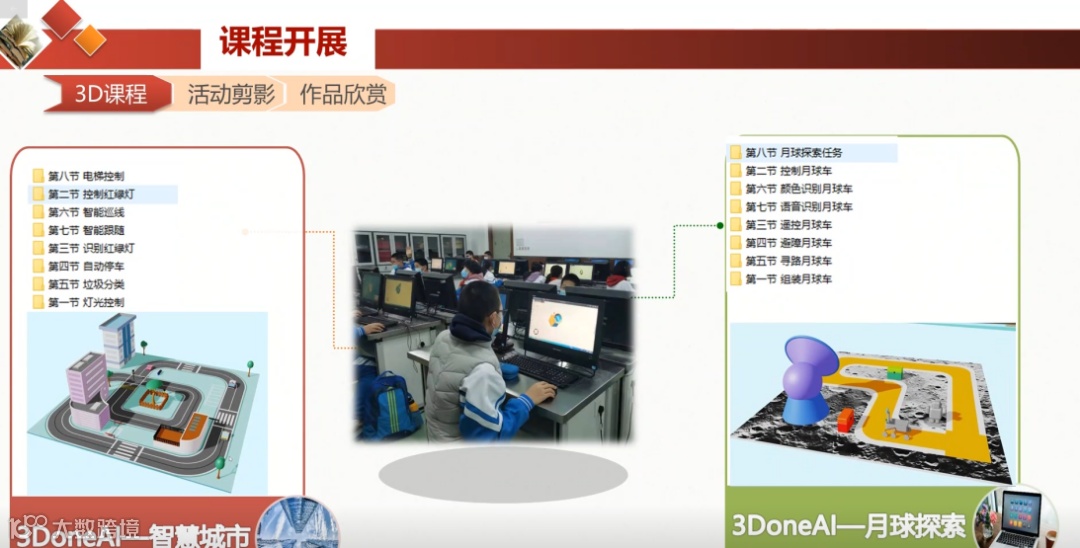 社团课程借助3D One AI,以三维仿真动画的形式将抽象的人工智能知识及技能呈现出来,降低了学生学习和教师教学的难度;学生不需要依赖真实硬件也能验证所学知识,为学校低成本、普及化开展AI课提供了更便捷、更灵活的方式。