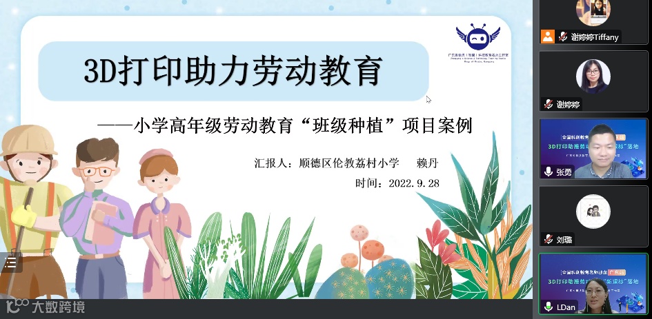 随后,广东省科技教育张勇(智翼)名师工作室核心成员、佛山市顺德区伦教荔村小学科信科组长赖丹老师,以自己学校的劳动教育实施项目为例,向大家展示了3D打印技术在劳动教育课程中的应用情况。赖丹老师介绍到:“荔村小学为了为贯彻落实中共中央《关于全面加强新时代大中小学劳动教育的意见》、教育部《大中小学劳动教育指导纲要(试行)》以及省、市关于全面加强新时代中小学劳动教育的实施意见等文件精神,准确把握内涵,传播劳动教育先进理念,落实劳动课程标准,打造“知善”校本课程,计划在新学校南、北两面走廊开展班级种植基地,用于学生植物栽培和花卉种植劳动实践研究,'3D打印助力劳动教育'项目便应运而生。”